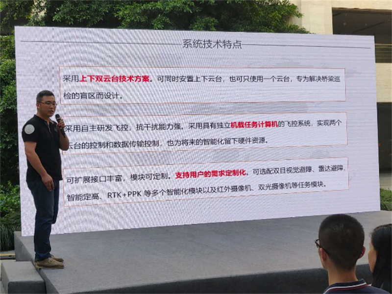 若联科技的合作伙伴清华大学公共安全研究院的客户代表,现场向嘉宾介绍了基于无人机开放平台I-800的桥梁巡检系统应用场景及应用需求。相比于桥梁巡检车、爬壁机器人、爬索机器人,无人机巡桥系统支持上下双云台系统、独立机载任务计算机飞控系统、灵活定制,不受空间维度限制,对桥底、索塔侧面、索缆均可进行巡检,地面站PAD可实时存储回传影像资料,替代部分人工巡检工作,有效提高人员效率,降低成本和风险。