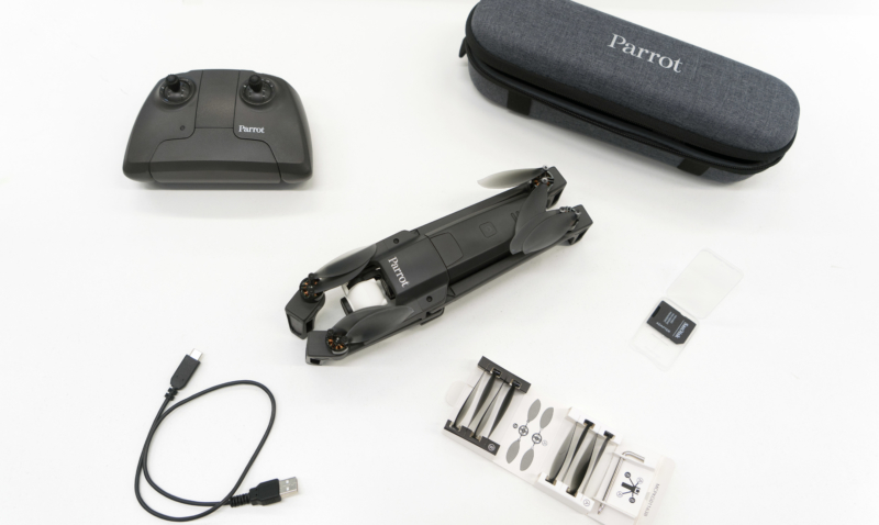 Parrot Anafi 开箱所见,除了航拍机、遥控器、随身包外,也附送基本的 USB-C 充电线、一套 AB 桨叶各一组的后备桨翼,以及一张 Micro SD 转接器(或称适配器)。随机亦已安装上 16GB 记忆卡。