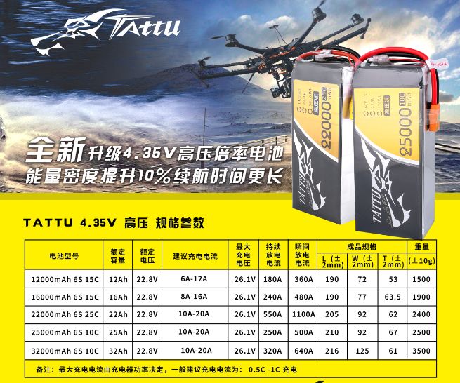TATTU全新无人机系列电池定位为无人机行业的专业品牌,TATTU再一次颠覆了模型的概念,让广大用户对无人机动力配套有了全新的认识。我们一直在致力研发新品以更好的配合无人机产品的飞行需求,TATTU闪耀面世,意味着格氏品牌在无人机行业的全新变革,无论从外观包装还是电芯工艺我们都力求完美。 TATTU针对无人机工业配套,可在影视航拍、农业植保、地质勘测、 森林防火、抗洪抢险、环境监测等领域广泛应用,相信可以给广大用户带来不一样的飞行体验。因为专注,所以选择;因为专业,所以信赖。