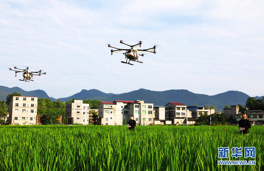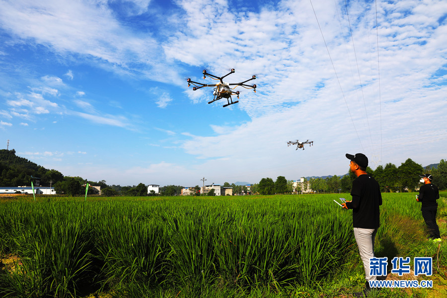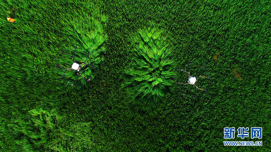 7月17日,重庆市梁平区回龙镇清平村,两架无人机在田间作业,对水稻进行施药。新华网发(高小华 摄)