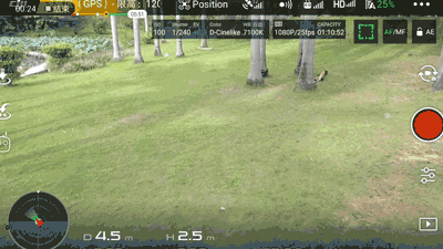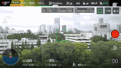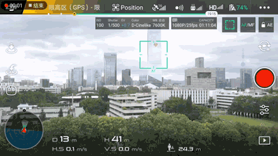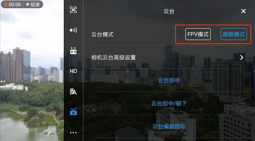 大疆无人机航拍器通常有两种云台模式可供切换。一种是跟随模式,云台水平转动方向随飞行器移动。还有一种是 FPV 模式,云台横滚方向的运动跟随飞行器横滚方向的运动而改变,以取得第一人称视角飞行体验。