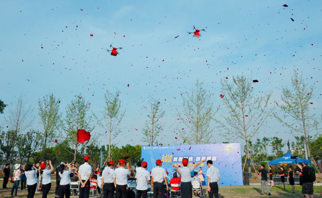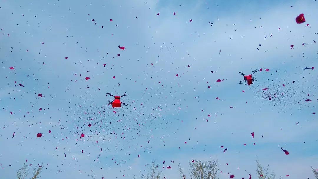 启动仪式现场,随着一声令下,两台易瓦特无人机缓缓升空,顷刻间漫天的玫瑰花瓣飘洒而下,一场浪漫的“玫瑰花雨”呈现眼前,让观众如至梦幻,将本次活动推向了一个小高潮。