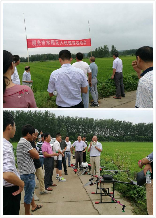 现场会上明光市农机推广站邀请厂家技术员为大家现场展示了植保无人机对稻田的植保任作业,技术人员熟练操作农用无人机平稳起飞,在稻田地上方低空飞过,农药被均匀地喷洒在作物上,受到与会领导和群众的一致称赞。