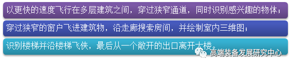 “快速轻量自主”(FLA)项目于2015年启动,致力于发展全新算法,使小型无人机仅凭所搭载的高分辨摄像机、激光雷达、声呐或惯性测量单元,便可在房间等设障环境中自主导航飞行、搜集态势感知数据。该项目在2016年利用商用四旋翼无人机在设置障碍物的机库内进行了验证试验,达到了20米/秒的飞行速度指标。未来,项目将继续优化避障算法,扩展感知范围,以更好进行急转弯等快速机动动作。
