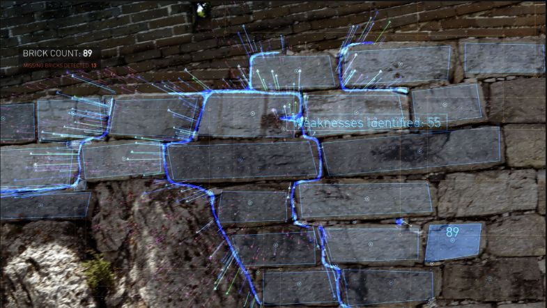 无人机高精度图像采集:因为长城的跨度很大,修缮之前首先需要进行环境勘测。传统的办法是通过尺子测量以及目测,很难得到精准的数据。通过英特尔®猎鹰 8+(Intel® Falcon™ 8+)无人机,工作人员能够近距离检测到长城的破损情况,可以获取高分辨率图像,帮助文保人员清晰、全面了解长城现状。