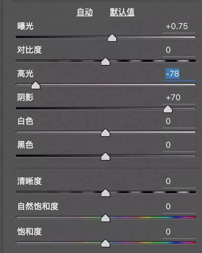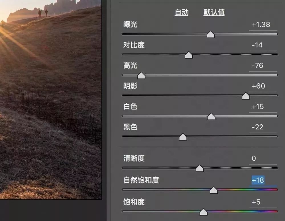 重新手动调整曝光参数,让高光阴影的恢复值不要太夸张。同时日落本来是暗光环境,因此我把曝光从自动的 +1.38 降低到了+0.75,恢复真实感。
