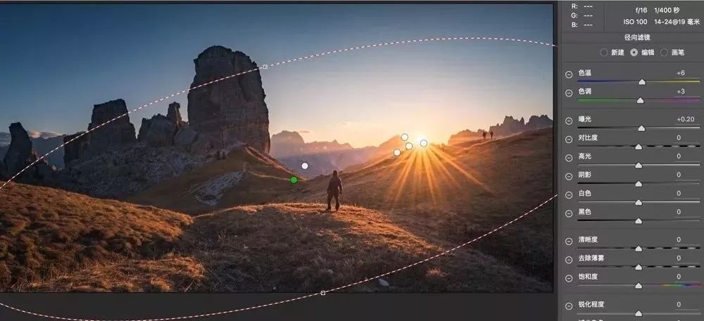 3 然后又设置了径向滤镜,色温 +6, 色调 +3,给应用的区域增加一层阳光的金色。同时曝光 +0.2 进行提亮。用这个参数,在太阳附近、草地受光面以及人物附近,建立多个径向滤镜, 让照片的亮部重新亮起来。