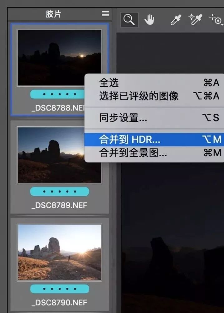 Photoshop 会把这 3 张原图加载到 Camera Raw 处理器中。我们在 Camera Raw 面板左侧,可以看到他们的略缩图,鼠标点击右键,全选图片后再次鼠标右键,选择“合并到 HDR”。