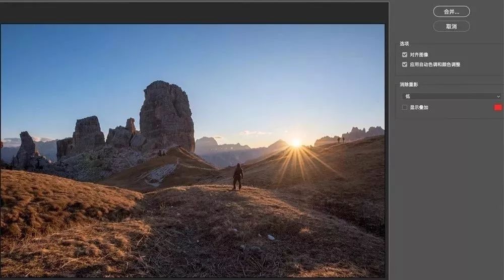 在打开的面板中,勾上“对齐图像” 和“应用自动色调和颜色调整”。“对齐图像”会修正 3 张照片拍摄时轻微的位移,而“应用自动色调和颜色调整” 则可以自动帮我们把合并后的高光阴影细节找回。