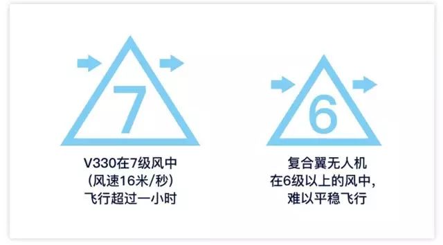该机能够在7级风中(风速为16米/秒)飞行长达一小时,而复合翼无人机则很难在6级以上的风中平稳飞行。