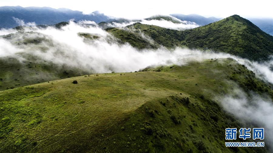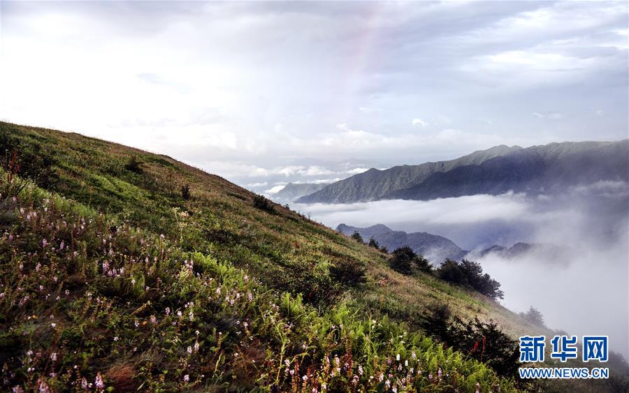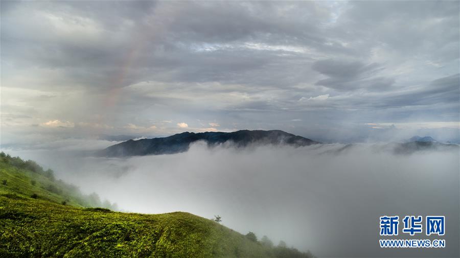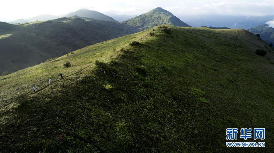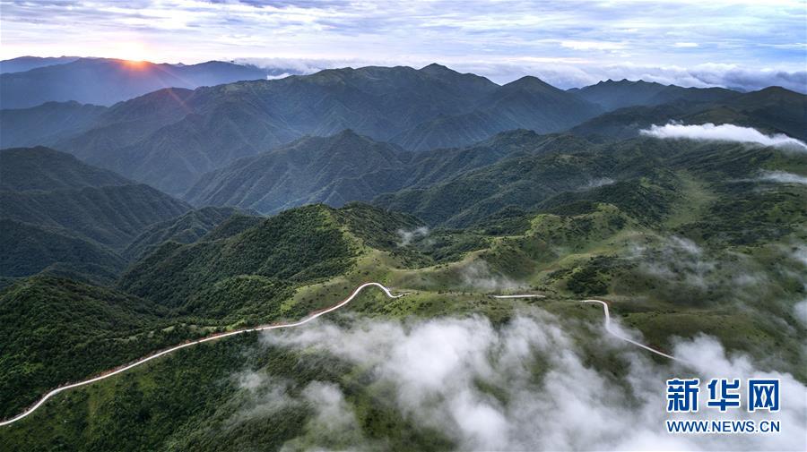 这是正阳草甸日出(7月27日无人机拍摄)。陕西省平利县正阳镇的大巴山脉上,有一处郁郁葱葱的高山草甸。盛夏时节,这里绿草如茵,野花遍地,一片清凉世界,成为夏日游人消暑休闲的好去处。新华社记者陶明摄
