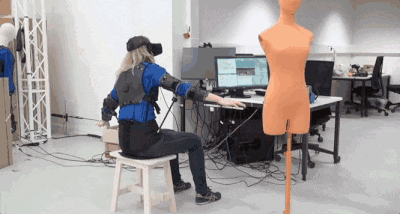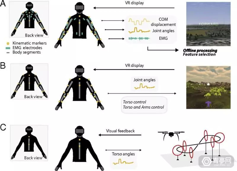 为此,研究人员找到一批志愿者。首先,给志愿者上半身加入19个动作捕捉标记(最后为一个穿戴背心),同给给他们佩戴VR头显观看无人机画面,最后让志愿者做出他们认为理想的、合理的动作来模拟操控无人机。