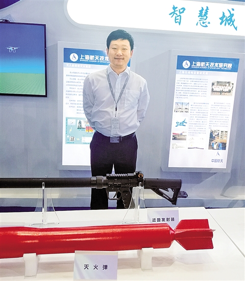 “智能集群无人机载灭火系统”积极参展相关领域的博览会,受到各界广泛好评,中国航天科技集团八院已经与多家单位达成合作意向。图为“智能集群无人机载灭火系统”的近距发射器和灭火弹参加第十九届中国国际工业博览会产品推介。