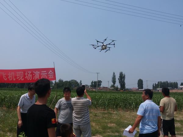本次活动主要是对无人机的工作原理、产品性能及相关技术参数、病虫害防治效果、作业时间、飞行偏离度、飞行姿态、定点飞行、电池充放、药液配比、灌装及后勤维护等几个方向做了详细介绍,同时就高粱喷洒药进行现场实地演示作业,该无人机一天可以作业300-500亩地,操作简单,喷洒作业时覆盖好并具有高效、节药、优质、安全、便利等优势。为今后进一步推广和应用无人机打下了良好的基础。极大的开阔了农民朋友对植保机械作业的视野,有力的加快了我县农业机械化统防统治进程,加快了传统农业种植模式向农业生产全程机械化、人工智能化植保模式转变的步伐。