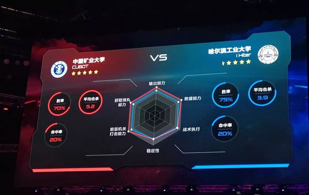 软件层面,即面向观众的第三方直播系统 UI 系统,和常见的电竞直播的 OB 系统类似,包括反馈血量伤害、地图等内容,此外软件还能生成六边形战术优势图,为双方的战斗力提供对比分析。与单纯的线上 OB 系统所不同的是,这套系统需要和机器人实体动态相结合,同样需要进行自主研发。