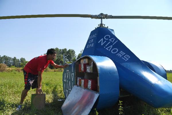 工作人员正在往无人直升机上装快递包裹。新华社记者周密摄