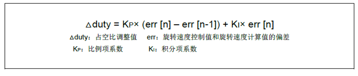 为了启动电机并且获取转子的位置信息,需要向电机提供一个60°的启动时序。以此触发霍尔信号对应的外部中断,并不断进行换相控制,从而让电机转动起来。而任意时刻(n)占空比的调整值由以下公式计算得到,从而实现电机旋转速度的调节。