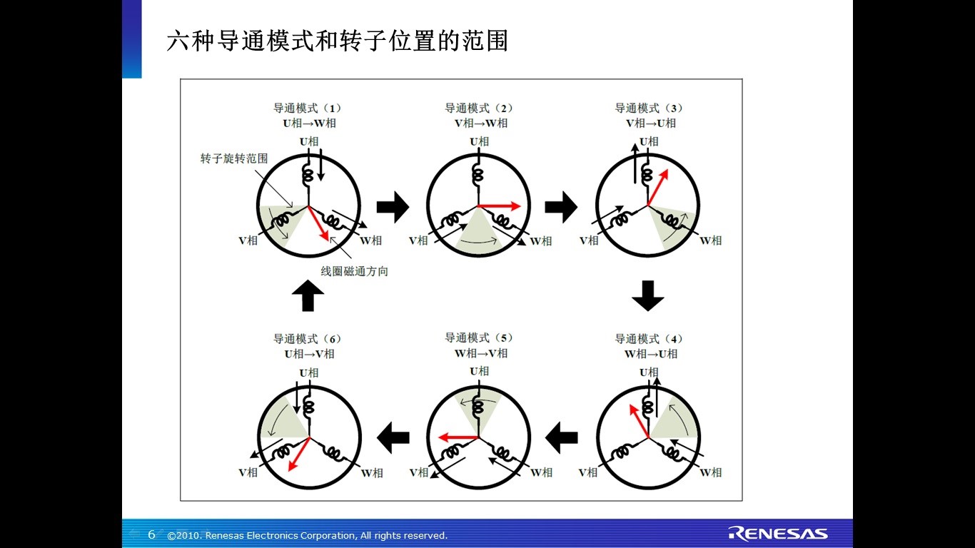 众所周知,3个霍尔传感器之间的间隔是120°,每个霍尔信号依据旋转磁极的方向进行切换。根据3个霍尔信号的状态,就能在每60°(每个周期有6 种模式)得到一次位置信息。如果每相的导通模式按照该时序进行改变切换,那么旋转磁通就会按下图那样产生,从而转子得到力矩并且旋转。