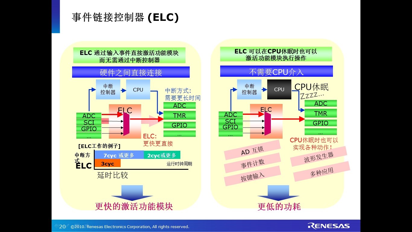事件链接控制器(ELC)可以在CPU不干预的情况下利用定时器触发(自动/延迟)A/D采样,提高电机控制的性能。