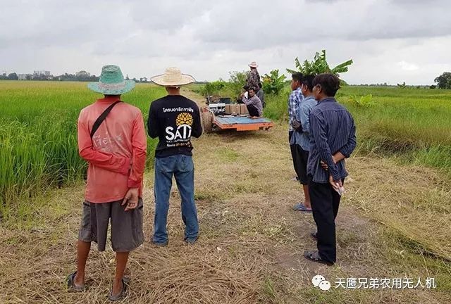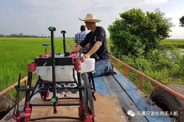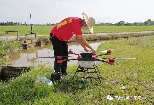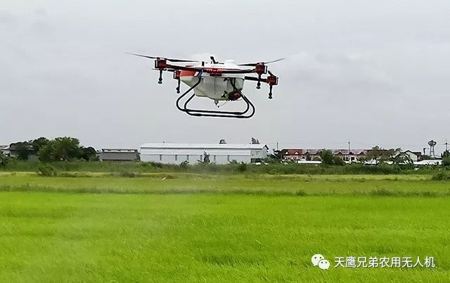 这是泰国专业植保服务队正在利用天鹰兄弟植保无人机对田地喷洒农药,每天可喷洒400亩,相当于30个人工。