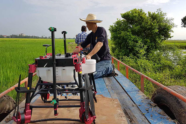 技术员正操控植保无人机作业这是泰国专业植保服务队正在利用天鹰兄弟植保无人机对田地喷洒农药,每天可喷洒400亩,相当于人工的30倍以上。这既可以提高效率,成本也低,植保无人机的普及运用受到当地农户的欢迎。
