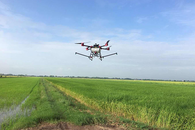 8月1日,在泰国一水稻田上空,一架载着10公斤农药的植保无人机,从田埂升上了天空进行喷洒。伴随着嗡嗡地声音,无人机在稻田2米的上空不断飞行移动着,雾化的药液,均匀地洒到了稻禾上。