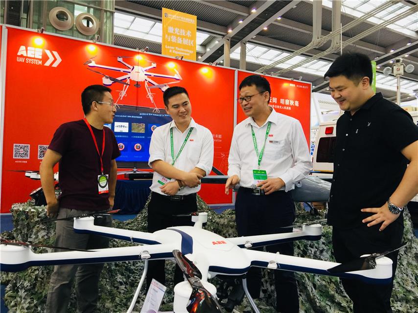 ↑2018宝安产业发展博览会上,深圳一电航空技术有限公司行销总监张志飞(左二)介绍自主研发的无人机产品。
