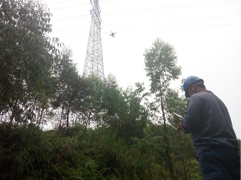 为有效保证输电线路的安全稳定运行,南方电网广西崇左供电局输电管理所运维人员紧急出动,冒着磅礴大雨从崇左市区出发,赶赴110千伏桃椒线跳闸测距范围55号至59号杆间查找雷击闪络故障点,积极应对此次雷暴雨引起的跳闸故障。直至到达目的地天等雨水才停歇,趁着雨停的片刻,“空中精灵”随着四轴旋翼无人机快速转动,只见一架配着高清摄像头的小型无人机在55号杆附近缓缓升空,无人机在运维人员梁颖勇的摇控下,游刃有余地在那些带电情况下运维人员无法到达的障碍区域,围着55号杆中相靠近绝缘子串飞行并拍照。