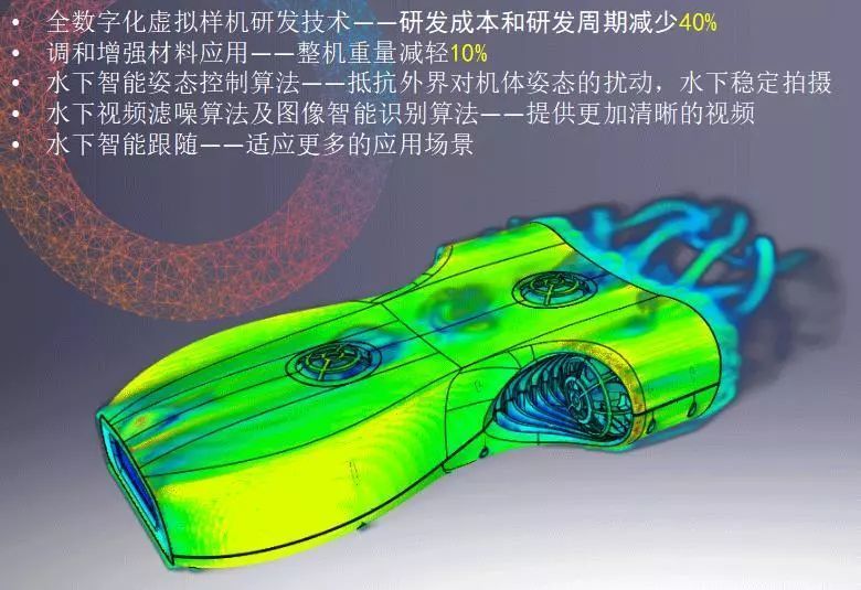 其中在研发阶段采用的全数字化虚拟样机研发技术和水下智能姿态控制算法,就是通过在计数机中建立虚拟化模型,再用算法控制模型面对水下的各种场景,然后反复调试出最优的模型和算法方案,最后再打样出实物完成少量的线下调试工作,这种形式有效地减少了40%产品研发时间和成本。