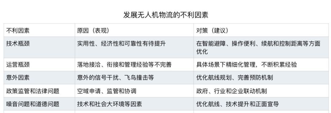 前文提到,无人机物流具有众多优势,但为什么在几年后它仍然没有被推广呢?新技术具有两面性,尤其在应用的初期,由于它们自身不够完善,加上经验不足以及受社会公众的思维习惯等影响,发展往往存在迟缓和反复的情况。客观来说,当前开展无人机物流存在以下不利因素: