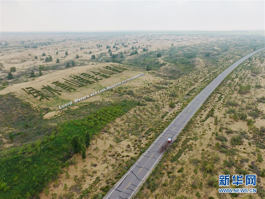 库布其沙漠中的一条穿沙公路,两旁绿意盎然(8月1日无人机拍摄)。 新华社记者刘磊摄