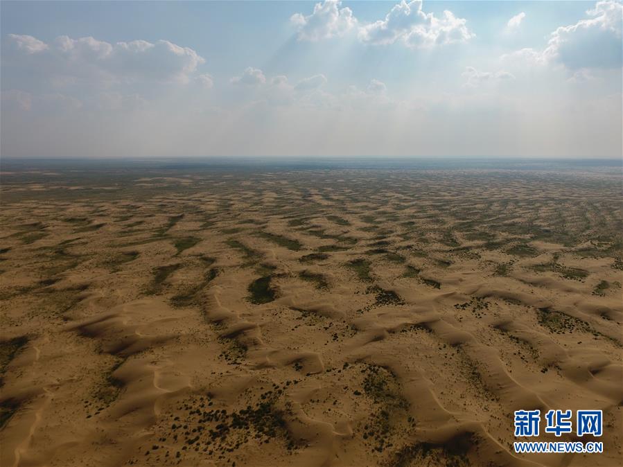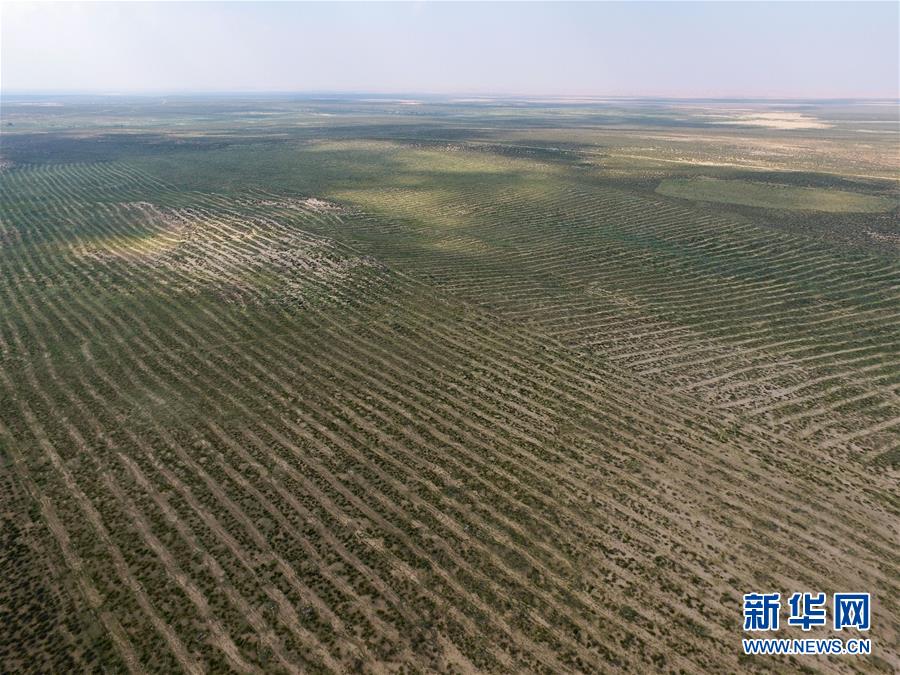库布其沙漠中的人工沙障(8月2日无人机拍摄)。 新华社记者刘磊摄