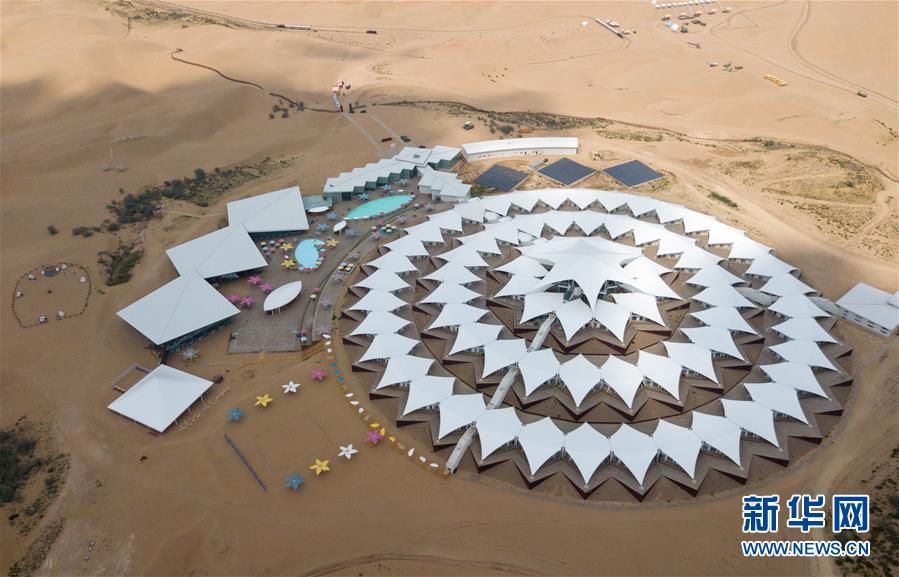 位于内蒙古杭锦旗的七星湖沙漠酒店(8月1日无人机拍摄)。 新华社记者邢广利摄