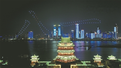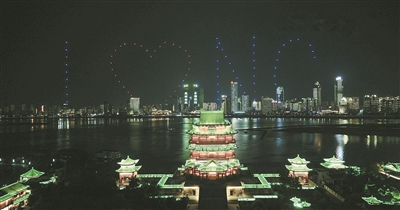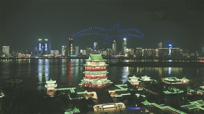 8月6日晚,南昌市一江两岸上空出现一幅幅美轮美奂的图案,引得不少群众驻足观看。