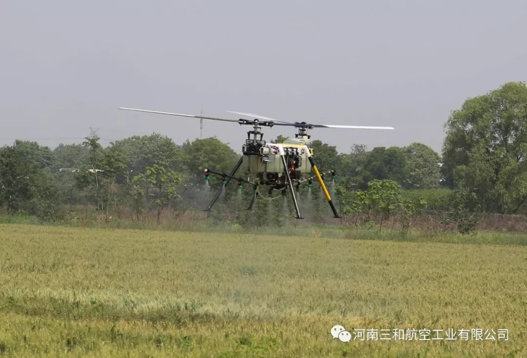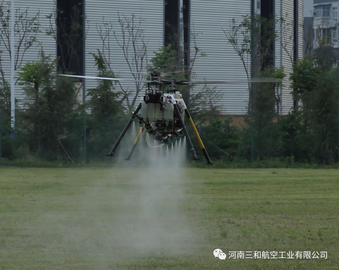 河南三和航空工业有限公司自主研发生产的植保版S50“小旋风”无人机载药量50公斤,一个架次10分钟可有效作业50亩以上,日作业量超过1500亩。横列双旋翼这种布局形式,目的是增加有效风场宽度,提高作业效率,大直径低转速的旋翼能提供更适合飞防作业的大而柔和的有利风场,能更好的使雾滴穿透作物到达底部及叶子的背面,减少药物漂移,实现更好的作业效果。S50“小旋风”无人机的动力系统选用了42马力的航空发动机,平均每亩油耗仅为0.35元,是一款大载荷、高效率、低成本的专业植保无人机。