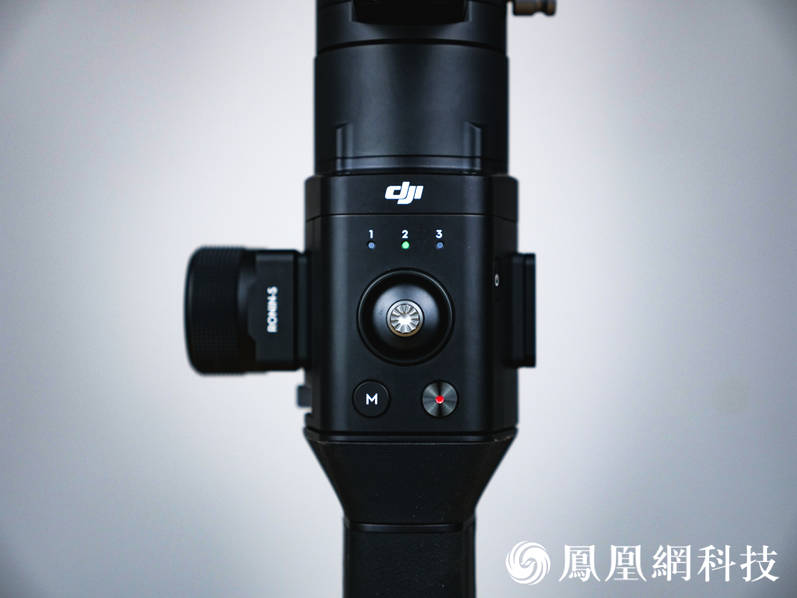 如影S的控制面板十分简洁,中间是摇杆,和无人机的摇杆很像,用来控制云台的移动,下方分别是模式按键和录制键,按住模式按键可以进入运动模式,该模式下,云台的响应速度更快,“跟手性”更好。
