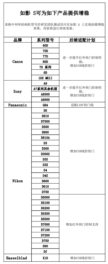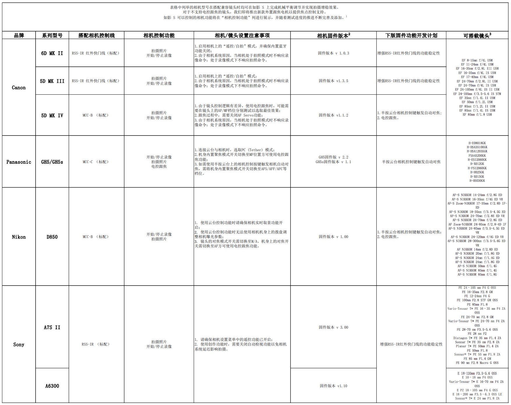 如影S可以通过连接线来对相机进行控制,如影S随机附带了type-b、type-c和红外三种控制线,能够适配不同的机型,其在手柄上设置了录制键并且标配了跟焦轮,目前经过最新的固件更新后,如影S已经能够支持通过线控GH5/GH5S、5D4以及D850的跟焦功能,至于索尼的机器,由于接口不开放的原因,只能是通过红外快门线来对相机进行控制了,而且支持的体验并不是太好,作为一个索尼大法的粉丝,我只能默默的哭泣了= =不过根据大疆的工作人员介绍,索尼线控的问题内部一直在优化,目前红外线控制基本已经没有太大bug 了,跟焦的固件还在持续开发中。