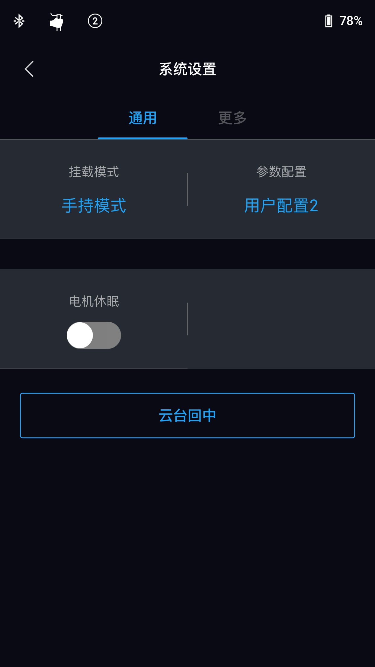 此外在配置菜单中,用户能够对电机参数、SmoothTrack、控制设定和系统设置进行调整,电机参数调整的是电机的动力,也可进行自动校准;SmoothTrack则是调整各个轴的平滑运动;控制设定中,能够调节各个轴的速度以及转动角度等,这里值得说一下的是通道设定,如影S的手电筒模式就是在这里将通道三调整为横滚轴来实现的;最后的系统设定可以设置挂载模式和云台的校准调整。
