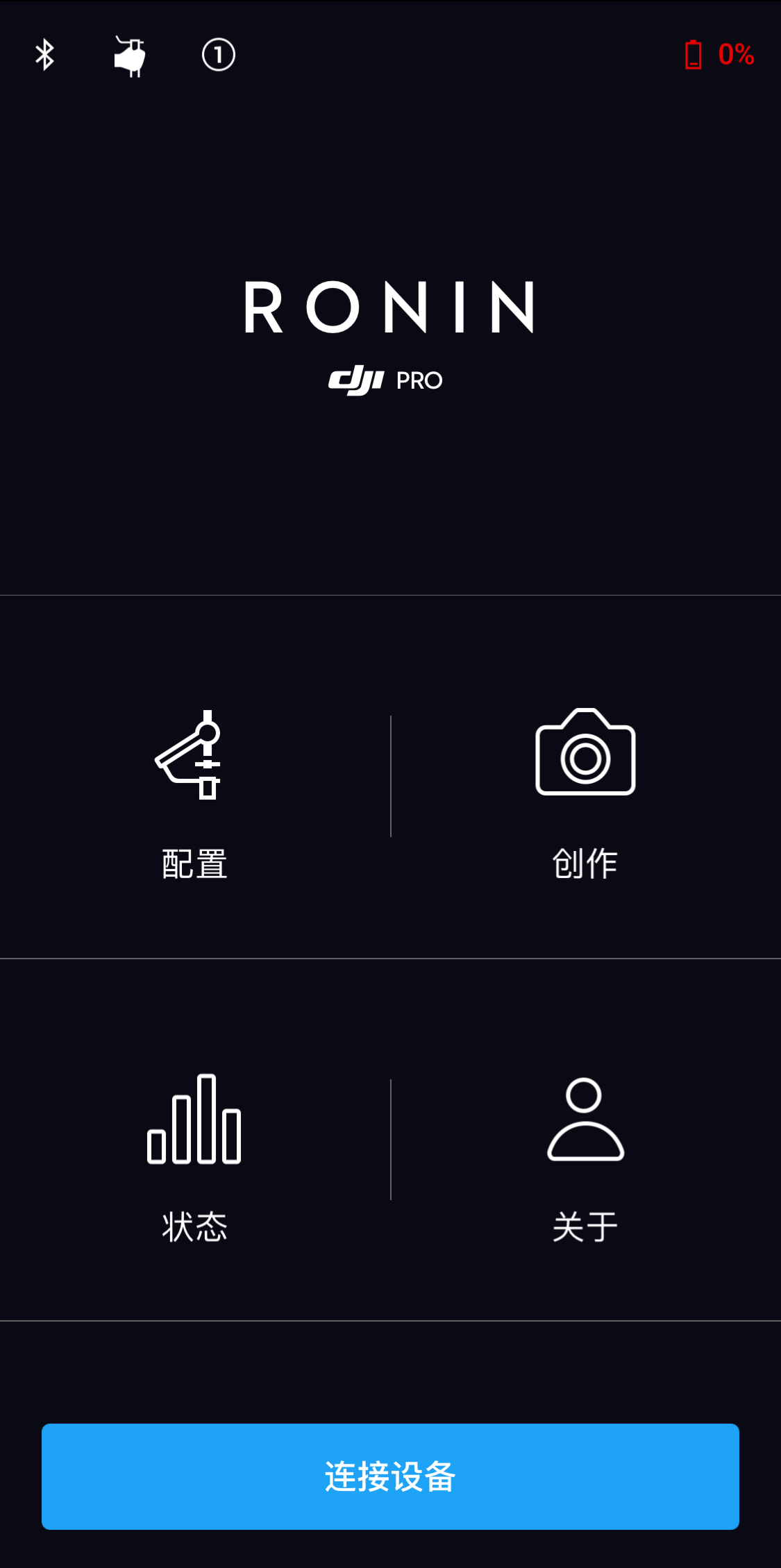 如影S在app上使用了单独的Ronin,而不是DJI GO系列,通过蓝牙连接app,主要分为配置、创作、状态和关于四个大类,能够对如影S的云台电机、方向轴等进行控制和调整。