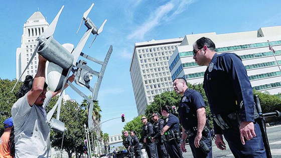 4年前,洛杉矶警局收到来自西雅图警察局的一份礼物:2架四轴无人机。西雅图警局送出这份礼物的起因,是因为西雅图市民对无人机项目的实施持坚决反对态度,导致这一项目没有通过。迫于无奈,西雅图警局只得出此下策,将2架无人机转赠给了洛杉矶。在洛杉矶,警用无人机的部署同样受到许多市民强烈反对。一个叫做“抵制洛杉矶警局秘密监视行动”的社会团体,在警方全面使用无人机项目通过后,进行了两天游行示威。