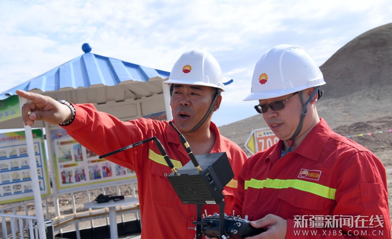 8月7日,操作手正在新疆油田环玛湖油区MaHW6203井场操作无人机传输演练现场实况