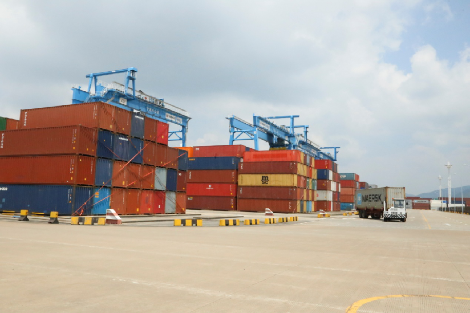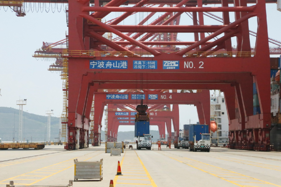图为忙碌的宁波-舟山港金塘港区大浦口集装箱码头,一辆集装箱搬运车正在缓缓驶出,码头现已开辟至西非、中东、俄罗斯及韩国等航区的13条国际集装箱航线。 新华网毛嘉炜摄