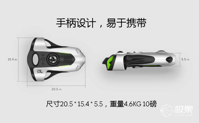 这款BW Space 水下跟拍无人机尺寸大小为20.5 * 15.4 * 5.5,重量为4.6KG 10磅,推力由三个螺旋桨(2 水平 + 1 垂直)提供,最大速度 2 m/s(6.6 英尺)。在设计上更采用符合人体工学的手柄设计,手感舒适,易于携带。为了增加功能,还提供了蓝牙控制器,以及3类型系绳长度分别为50米/ 100米 /150米)