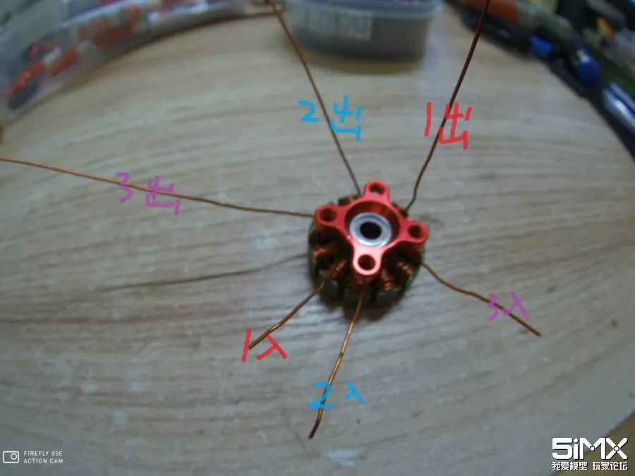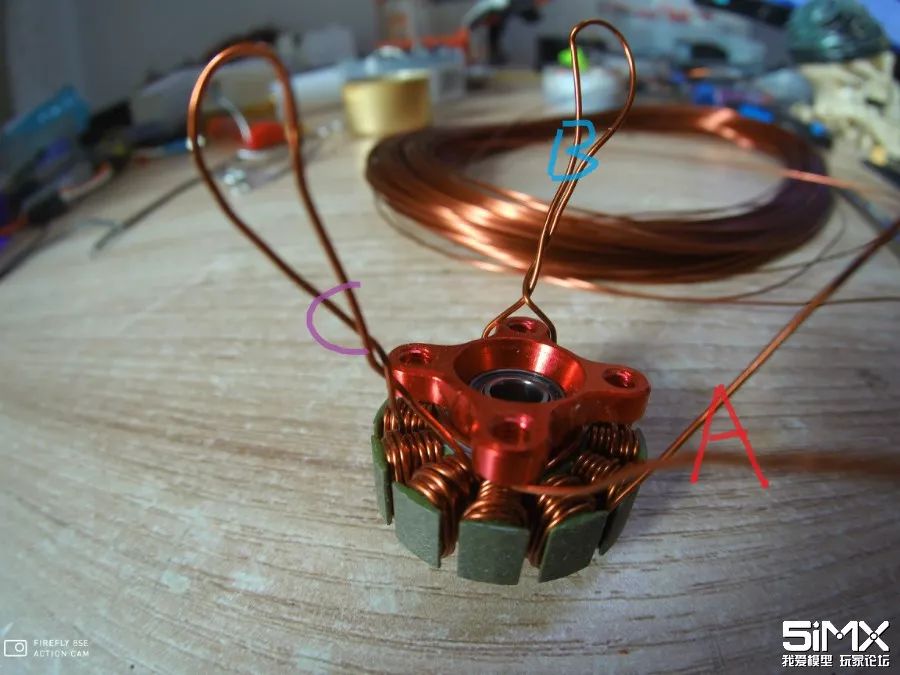 可以看到预留的2个弯头剪短每个弯头合并焊接一根硅胶线出来就是电机线。。。那么A就是最开始的线头和最后的线头合并,这样电机三根线就出来了。。此方法首先一根绕完,其次避免了最后有6个头你分不清的困扰。