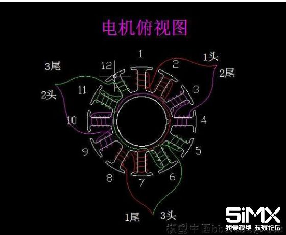 这就是一根线绕完了的重点,在12 78这一组结束后,绕的是9 10 和3 4这一组并且从8到9也就是整组过度的时候。留一个长弯头出来,这根弯头就是以后的电机线出线