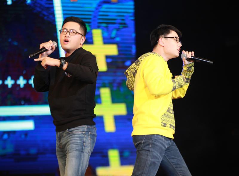 松江区城管队员林阁、薛青正在表演歌曲《城管有嘻哈》