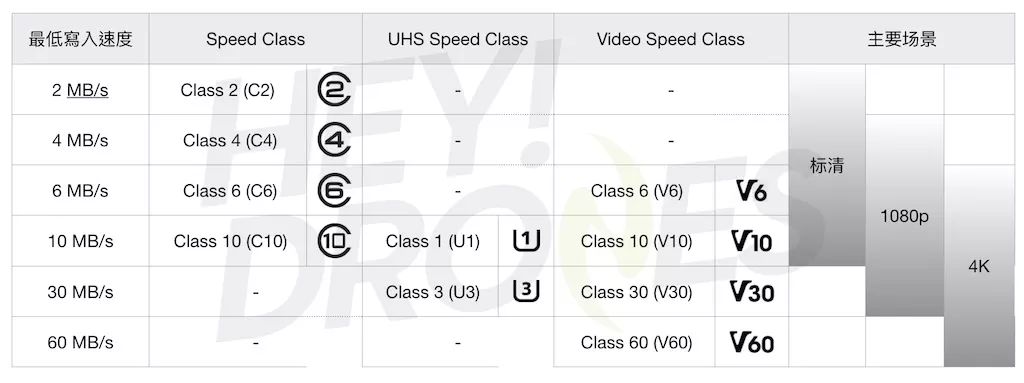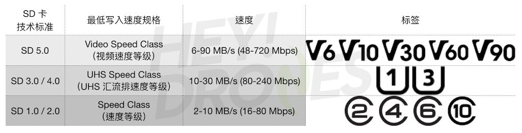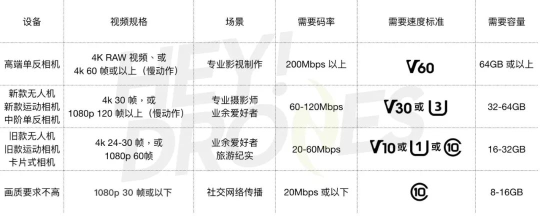 如果你是业余爱好者,使用索尼 A7 等专业相机、或是 Phantom 4 Pro 或 Mavic Air 等能支持 100Mbps 码率的新款无人机,那最少要 V30 或 U3 级别的 SD 卡;