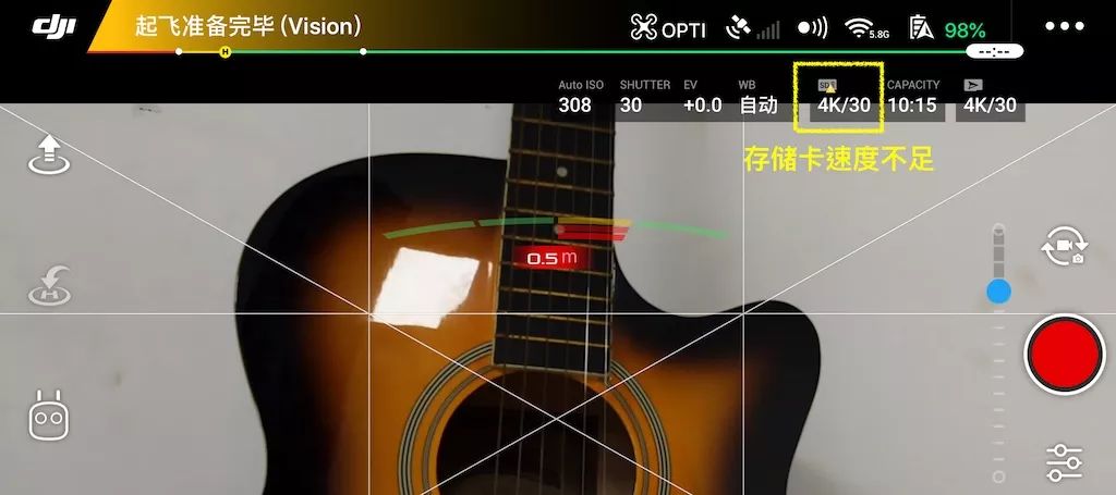 但如果把这张 80-95Mbps 的 SDHC 卡,插入支持 100Mbps 码率的 Mavic Air?DJI GO 就会跳出警告(上图),表示目前的贮存卡可能会影响拍摄质量。