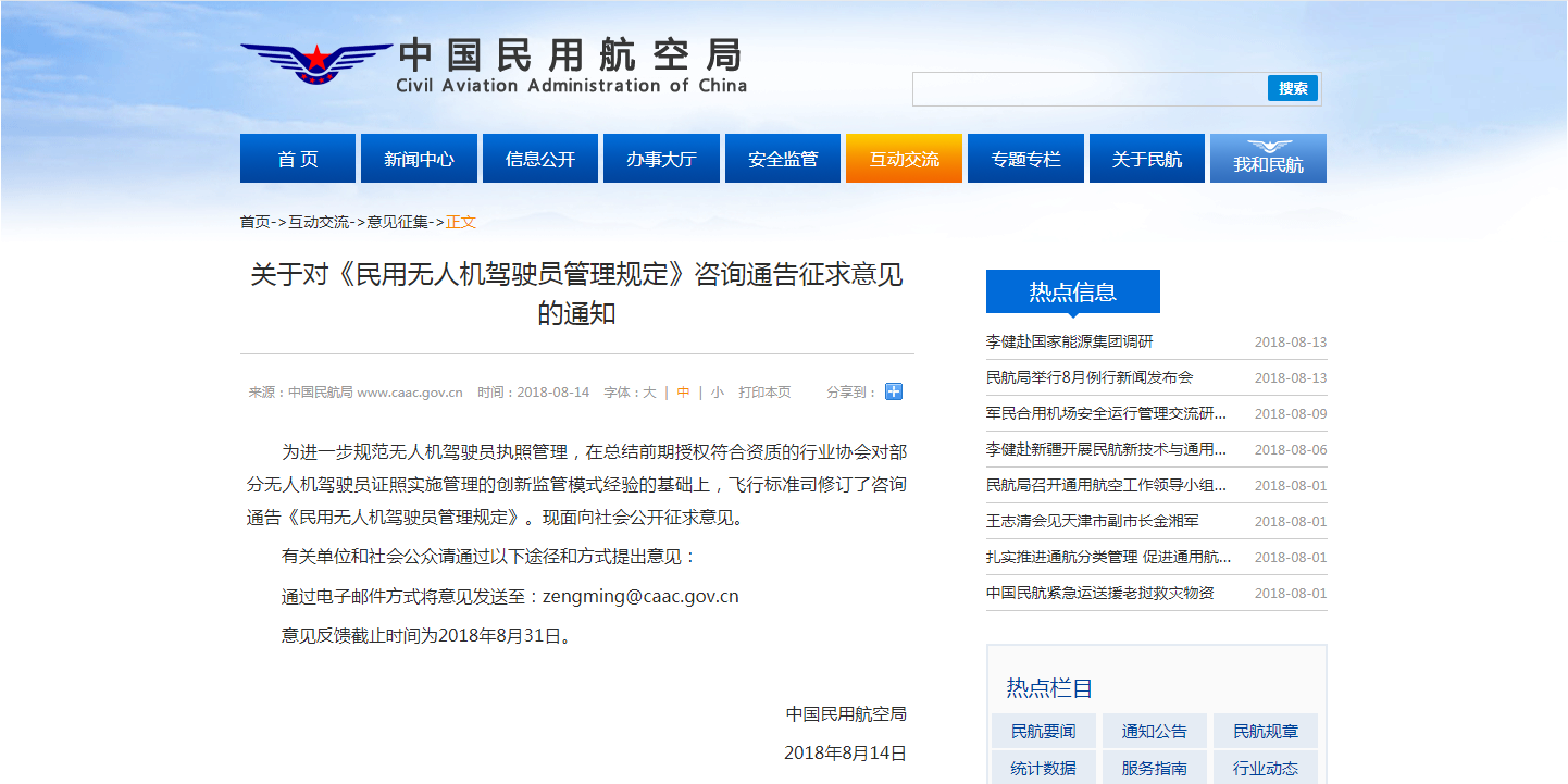 官方意见反馈邮箱:zengming@caac.gov.cn,截止时间:2018年8月31日