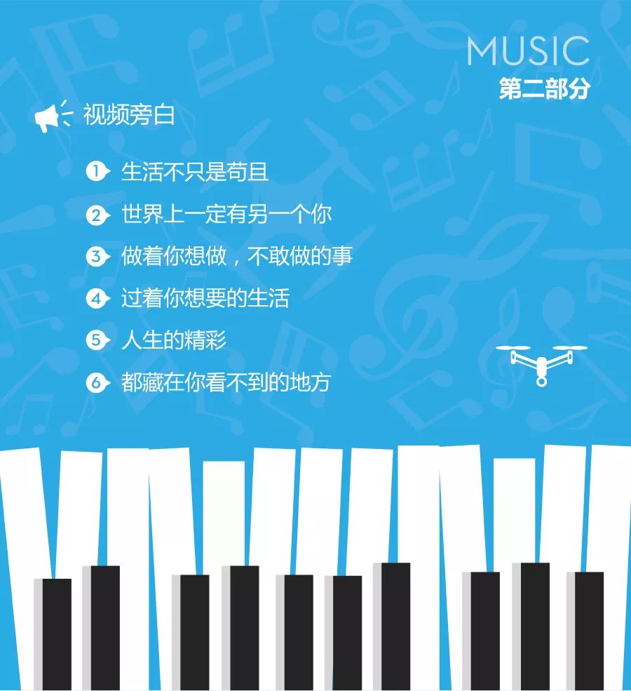 同时在选取背景音乐的时候应该选乐段有明显旋律变化的曲子,如果一首音乐通篇都是同一个旋律基调很容易让人抓不住重点。在乐曲高潮后,也应该还有一小段舒缓的乐段,情绪收回来搭配画面实现结尾。